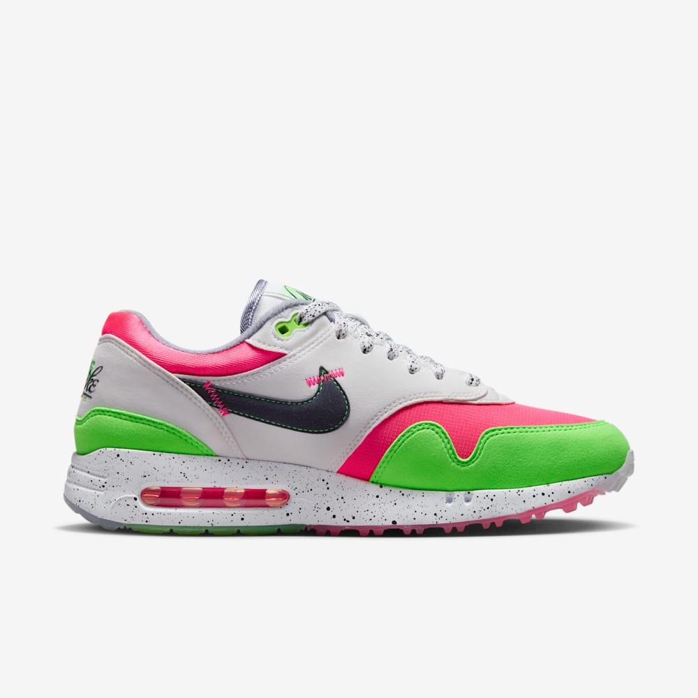 Step onto the course in style with the Nike Air Max 1 ’86 Golf NRG U23 “Big Bubble – Watermelon”, a vibrant and playful twist on a classic silhouette. This sneaker pays homage to the juicy summer fruit with its neon green overlays and striking hot pink mesh, while the speckled midsole evokes watermelon seeds for a bold, thematic finish.