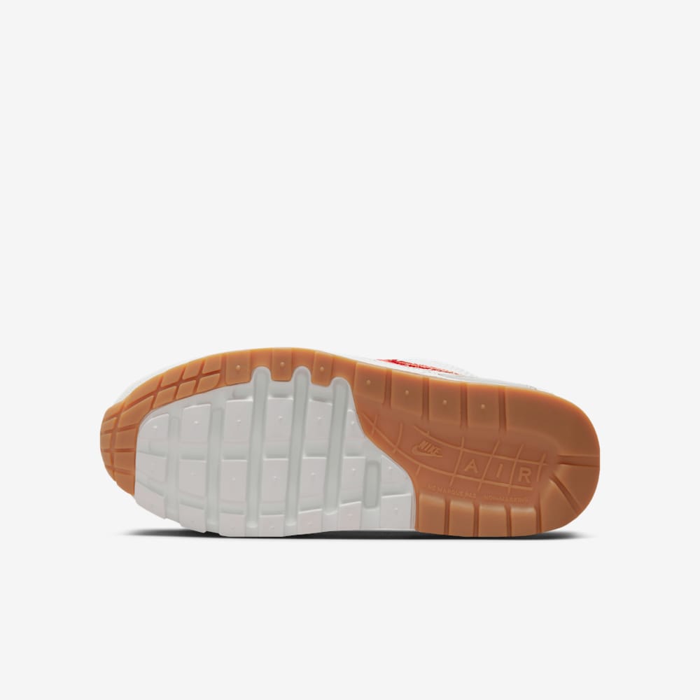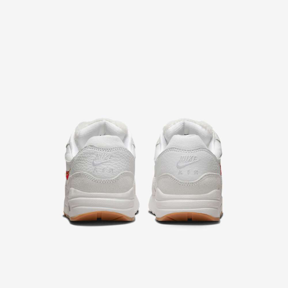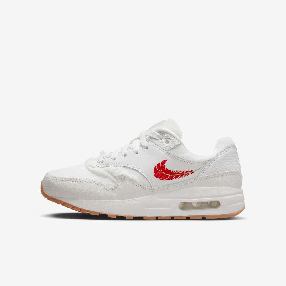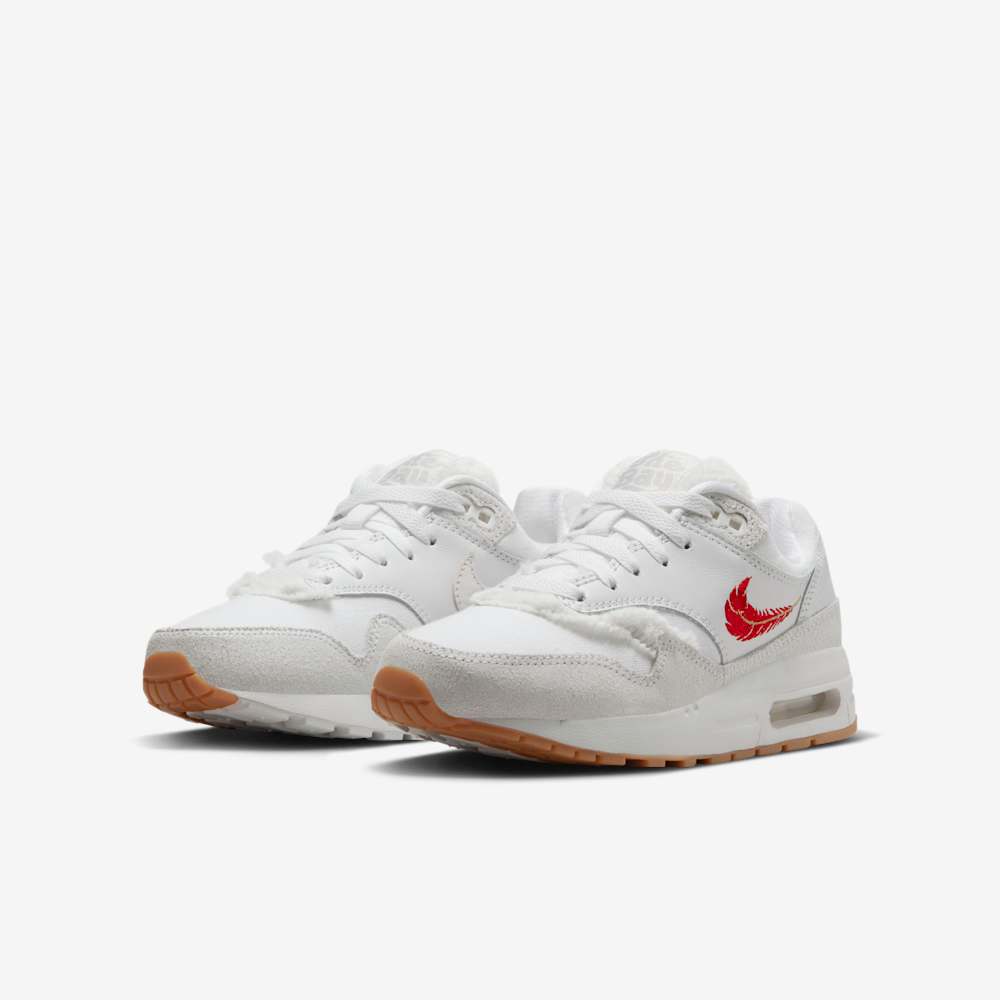 Underfoot, the visible Max Air unit in the heel delivers classic Nike cushioning, while the gum rubber outsole provides traction and vintage flair. Finished in a clean White and University Red colorway, this shoe strikes a perfect balance between everyday wearability and artistic expression.