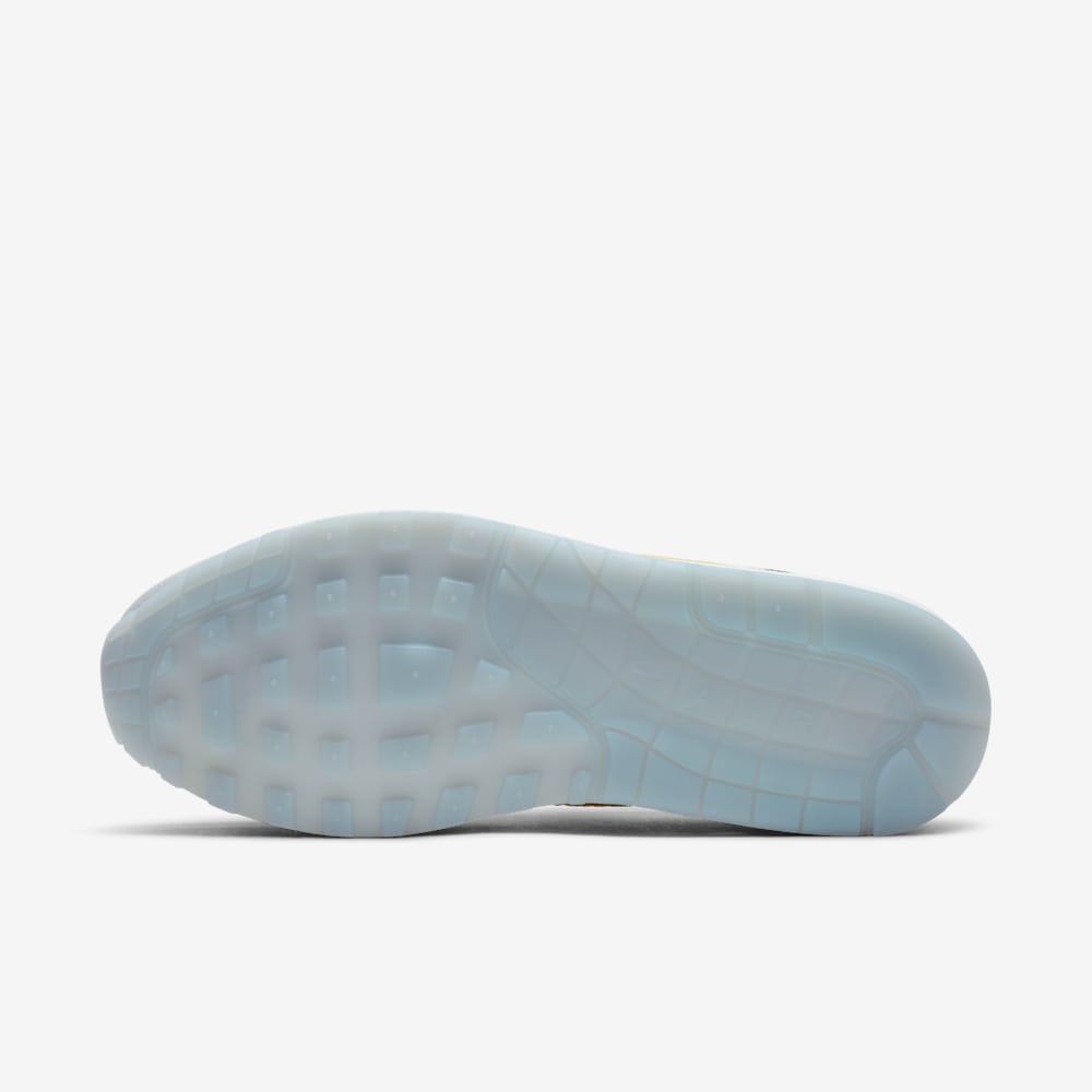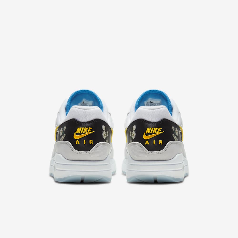 Distinctive design elements include a black-and-white daisy pattern on the heel and a blue-and-white daisy motif adorning the tongue, adding a whimsical touch. Pale green laces provide a soft contrast, while a bright yellow fabric Swoosh stands out on the sides. The heel showcases a vivid green Air unit, offering both comfort and a pop of color. Underfoot, the white midsole is paired with an icy blue translucent outsole, completing the fresh aesthetic.