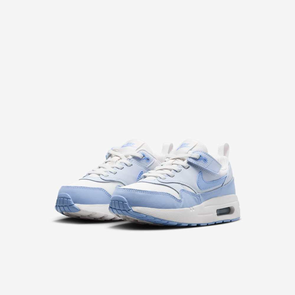 Step into comfort and heritage style with the Nike Air Max 1 EasyOn PS “Sail Blue Tint”. This preschool-sized sneaker brings the iconic Air Max 1 silhouette to little feet with kid-friendly features and a fresh, clean color palette. The EasyOn system makes slipping in and out a breeze, perfect for kids who are always on the move.