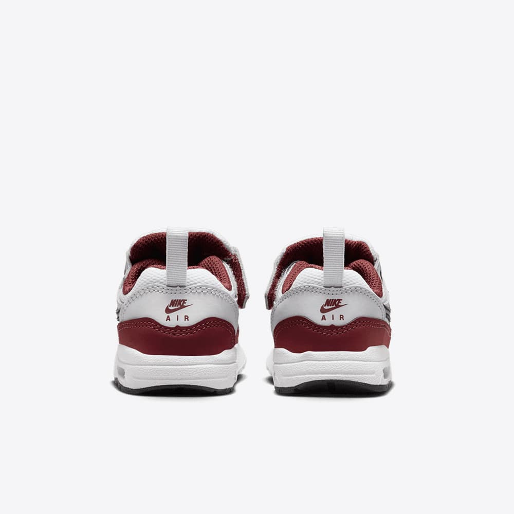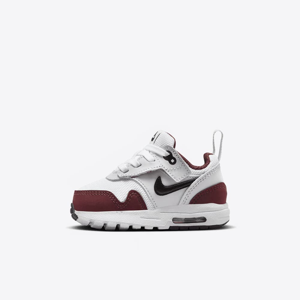 The Nike Air Max 1 EasyOn TD “Dark Team Red” (style code DZ3309-111) brings the legendary Air Max silhouette to the earliest sneaker enthusiasts with toddler-friendly ease and bold heritage colour-blocking. Rendered in crisp white with rich Dark Team Red Heather overlays, Pure Platinum accents, and black detailing, this version strikes a perfect balance between playful and premium.