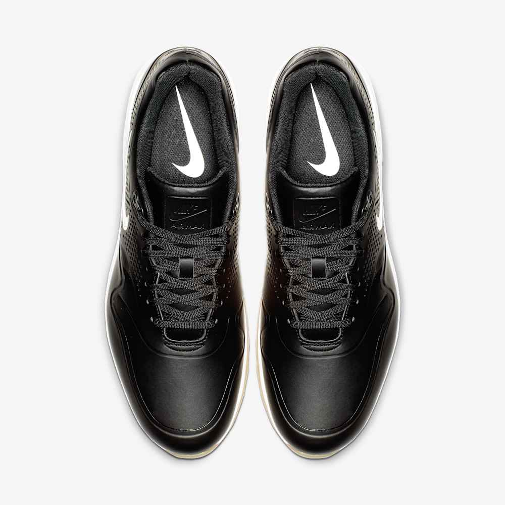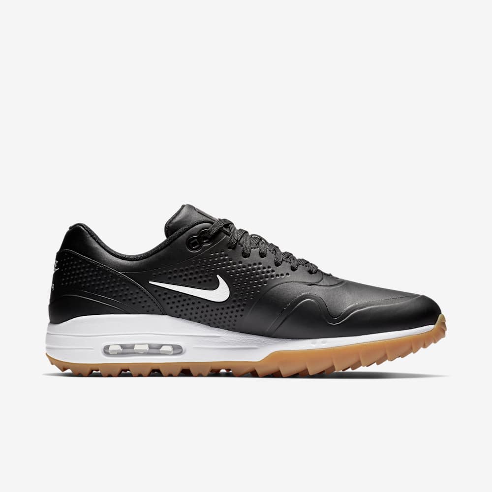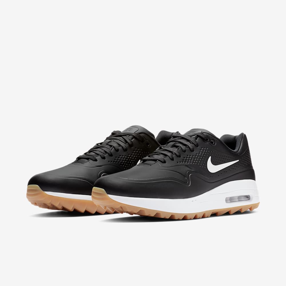 The Nike Air Max 1 Golf “Black Gum” (style code AQ0863‑001) is a men’s golf performance version of the classic 1987 Air Max 1, officially released on January 30, 2019. It features a sleek black leather upper with no‑sew overlays for added water resistance, complemented by a crisp white Phylon midsole that houses the signature visible Air unit for cushioning. The standout feature is its gum-light brown outsole, designed with a golf-ready traction pattern for solidity on the course. Originally retailed at $120 USD, this model blends Tinker Hatfield’s timeless design with performance enhancements tailored for golf.
