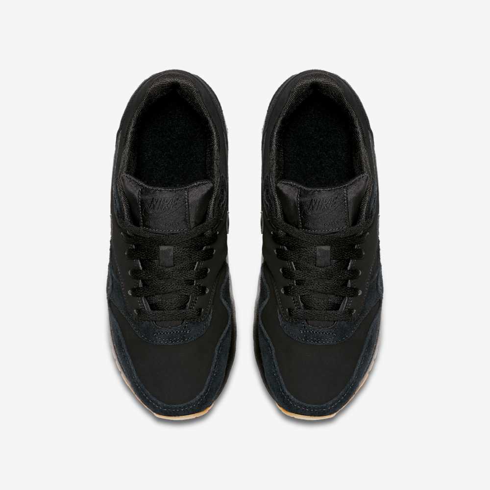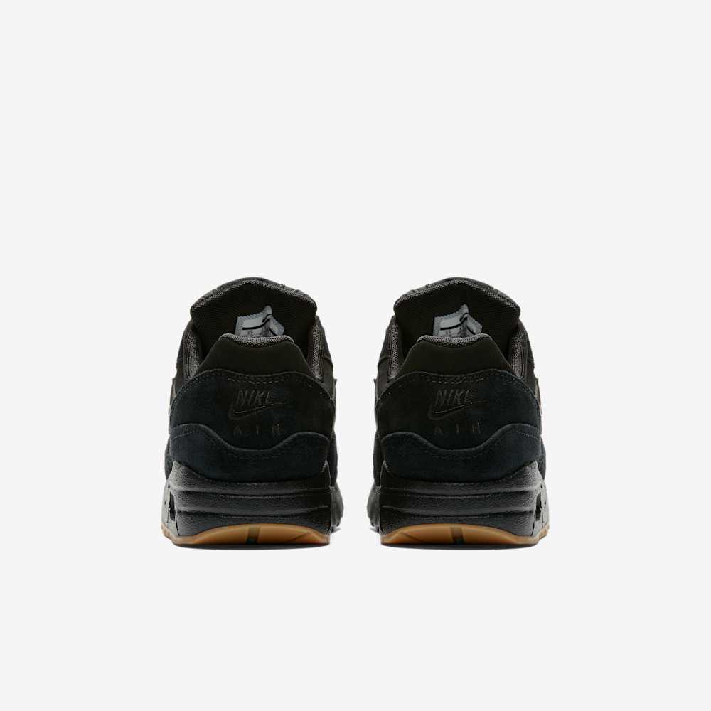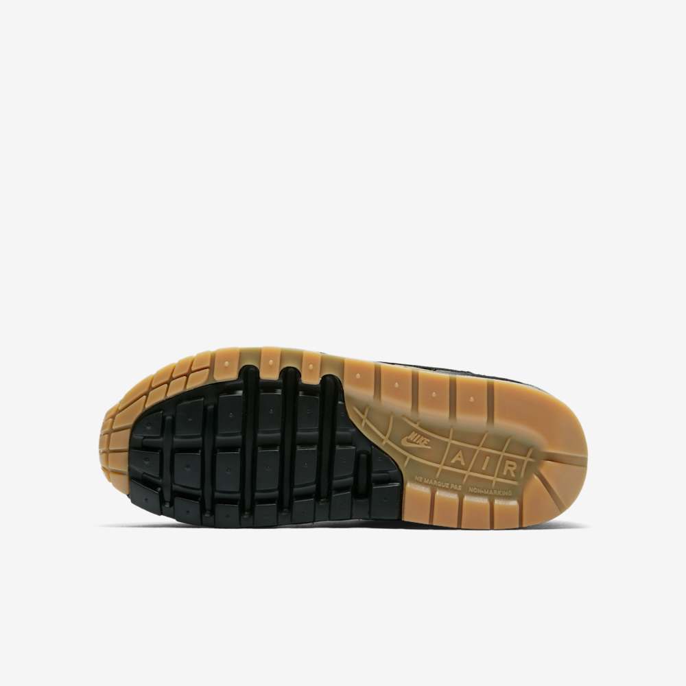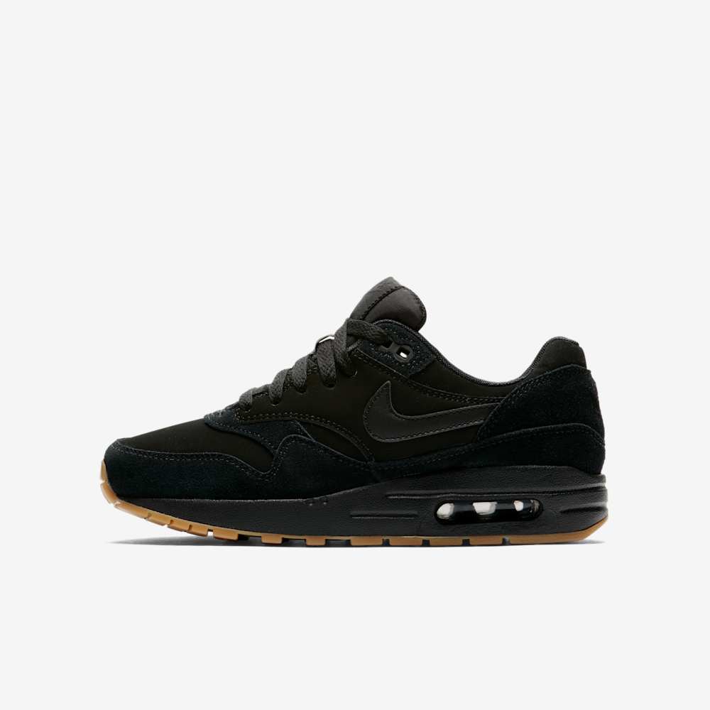 The Nike Air Max 1 GS “Black Gum” is a youth-sized iteration of the iconic Air Max 1 silhouette. This model features a sleek black upper constructed from a mix of natural leather, synthetic materials, and textile, providing durability and comfort. The design is complemented by a contrasting gum-colored rubber outsole, offering both traction and a classic aesthetic.