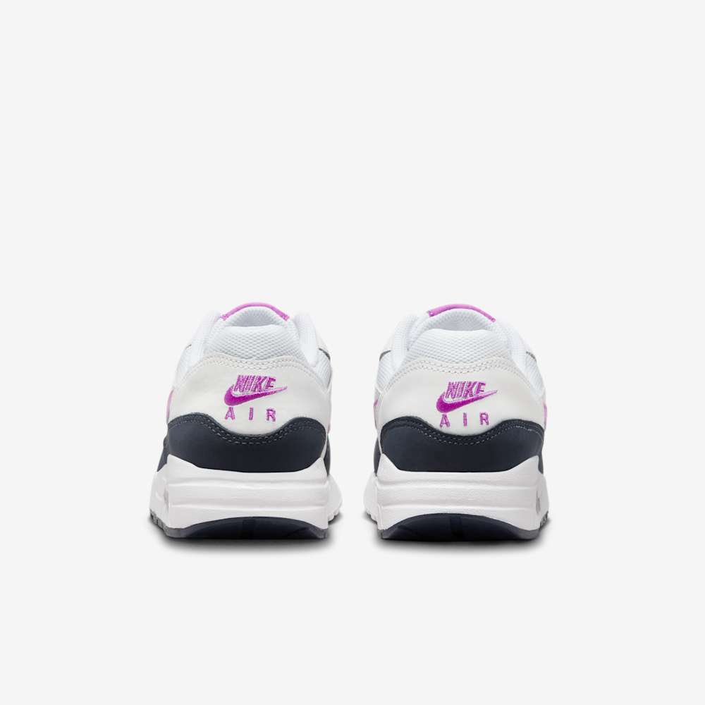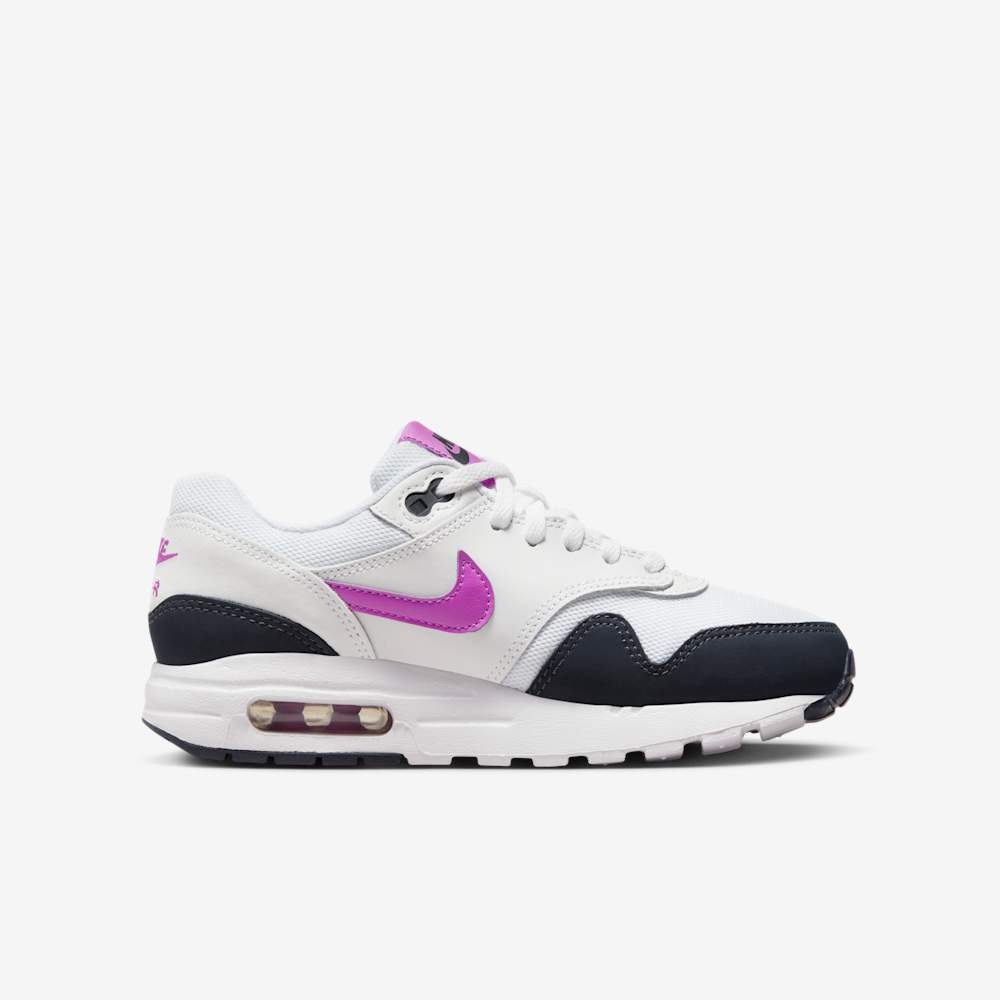 The Nike Air Max 1 GS “Fuchsia Dream” delivers timeless Air Max style with a playful twist designed just for kids. This grade school-sized sneaker features a clean white mesh and leather upper, contrasted by a bold black mudguard and outsole for a sleek, classic look. Adding a pop of personality, vibrant purple accents light up the Swoosh, tongue tag, insole, and heel branding — perfect for young wearers who want to stand out.
