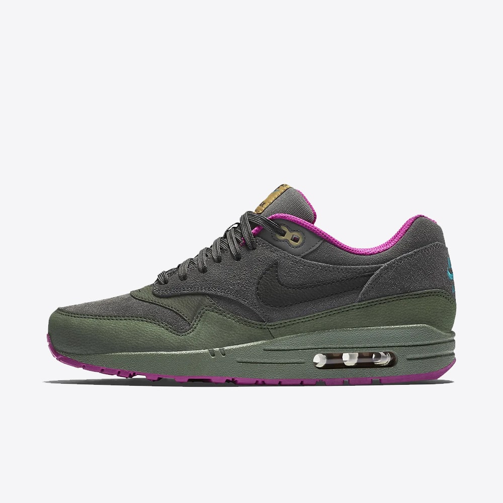 The design combines muted Dark Pewter and Carbon Green tones with bold Fuchsia Flash accents on the lining and outsole, creating a striking balance between subtle and vibrant. Sitting atop the lightweight foam midsole with a visible Air unit in the heel, this pair delivers the signature comfort and timeless style that the Air Max 1 is known for.