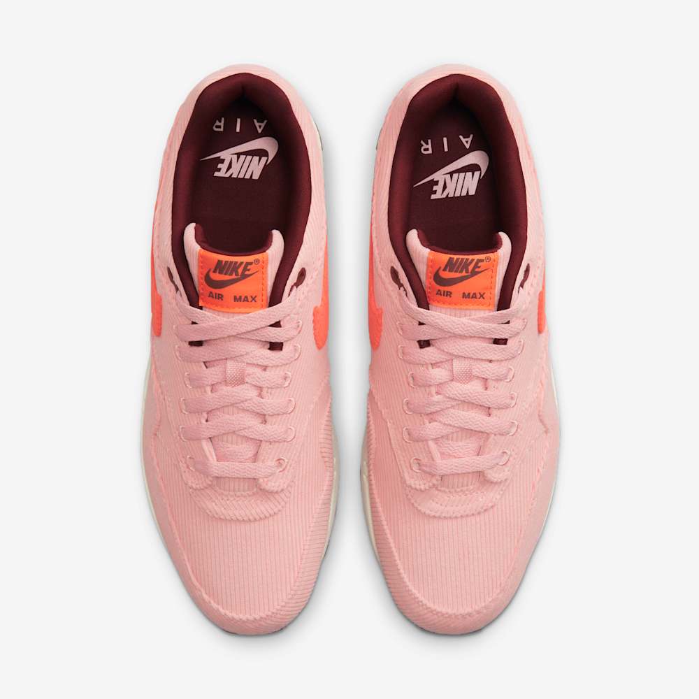 The Nike Air Max 1 PRM “Coral Stardust Corduroy” transforms the iconic 1987 silhouette with a full corduroy upper in soft, pastel pink (Coral Stardust), contrasted by a vibrant Bright Coral Swoosh and matching tongue label. Deep Oxen Brown tones on the lining, heel badge, and outsole enrich the aesthetic with a warm, earthy contrast, while an off-white midsole showcases the visible Air unit for classic cushioning.