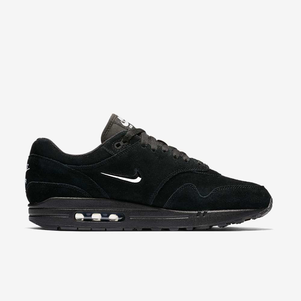 This model is cloaked in an all-black suede upper, offering a stealthy and refined aesthetic. Its standout element is the jewel Swoosh rendered in a chromed / metallic accent, which contrasts subtly yet elegantly against the dark backdrop. The design maintains the classic Air Max 1 structure with a visible cushioning unit in the heel and a tonal rubber outsole for a cohesive look.