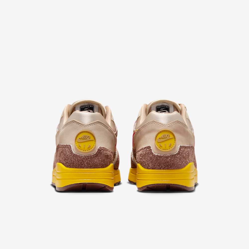 Constructed with a hair-brown suede mudguard, cream mesh upper, and a vivid red polygon Swoosh, the design also features a yellow midsole and oversized tongue to enhance its presence. The classic visible Air cushioning remains in place, while the playful aesthetic transforms a performance icon into a cultural artifact.