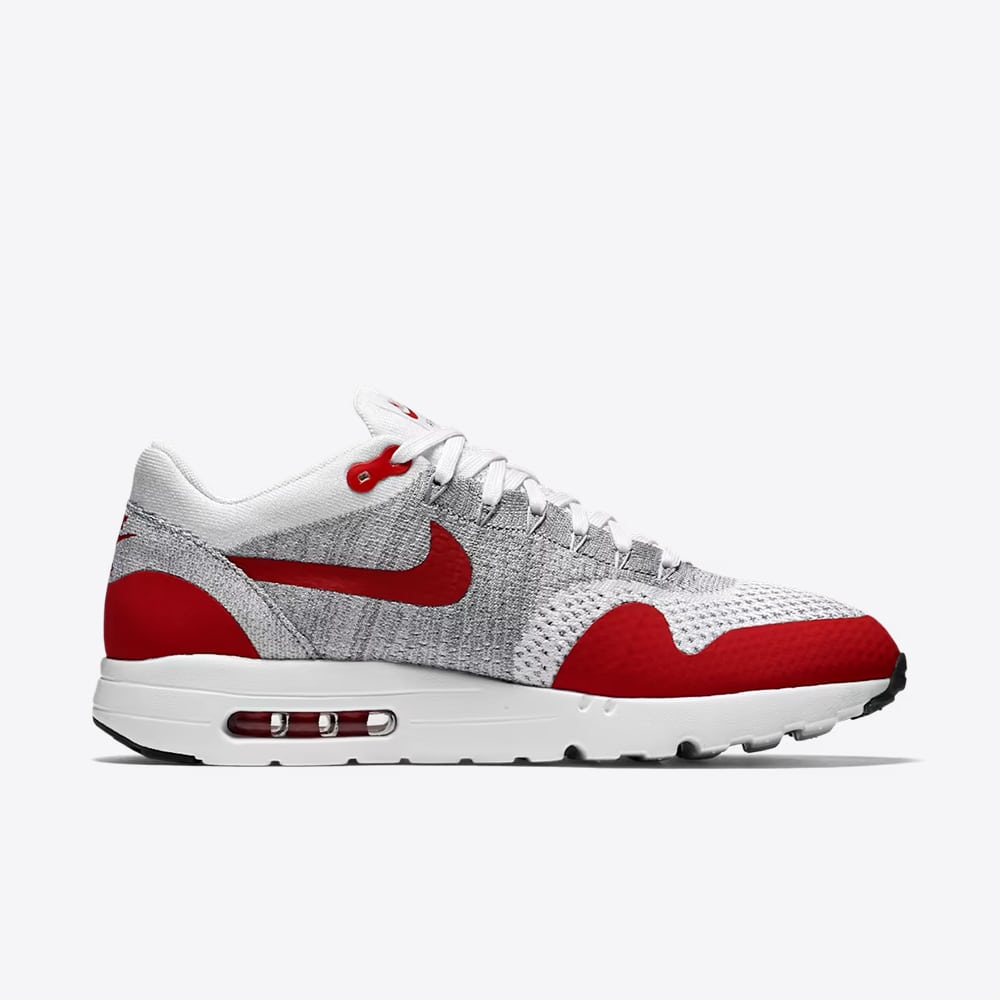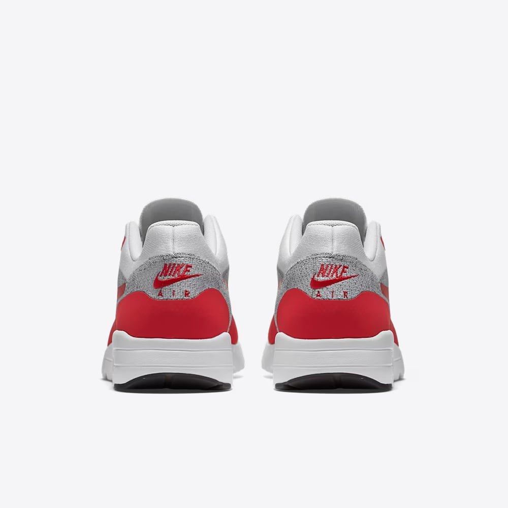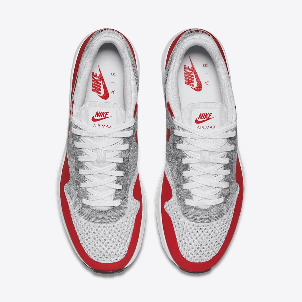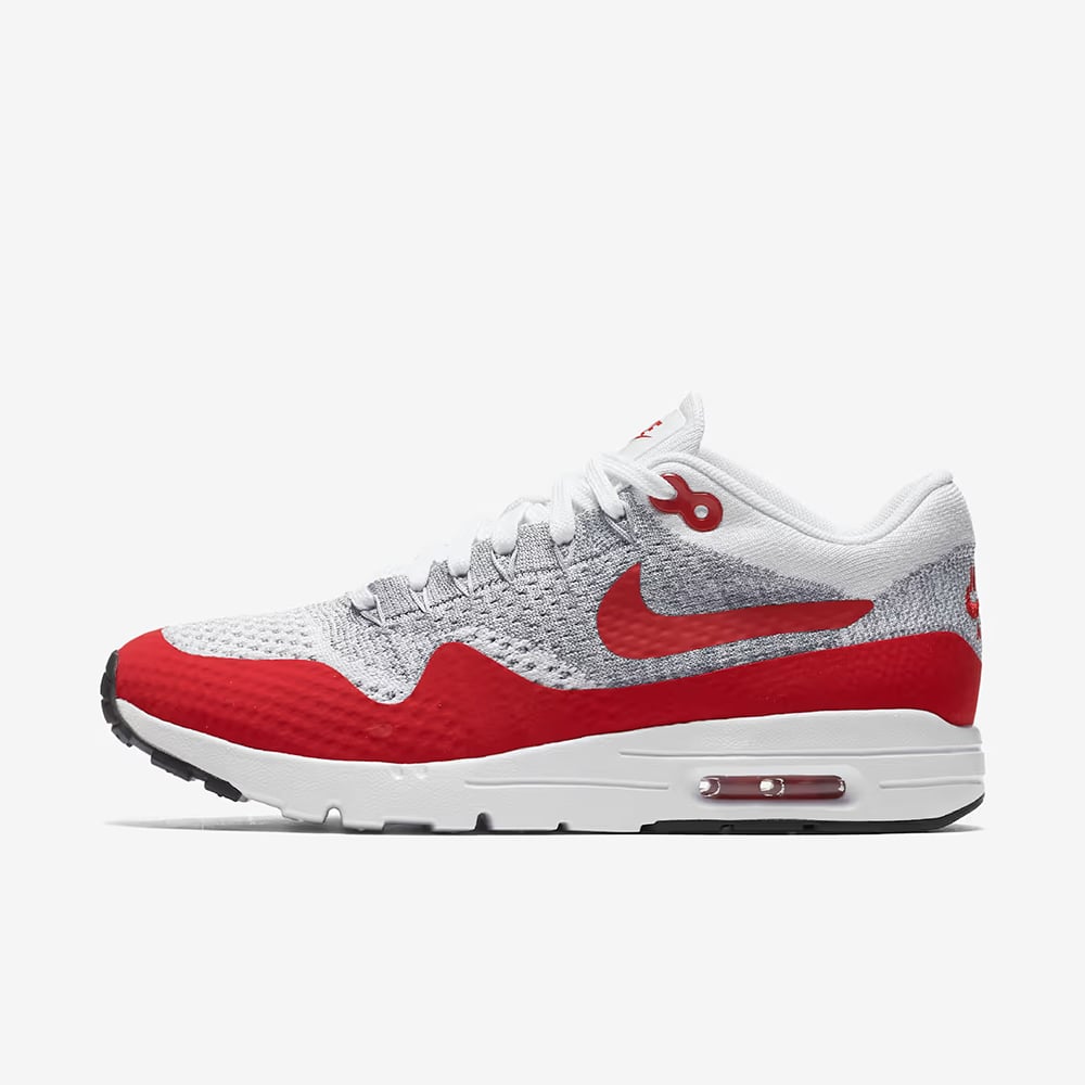 The Nike Air Max 1 Ultra Flyknit “White University Red” is a sleek and modern reinterpretation of the classic Air Max 1 silhouette. Crafted with a lightweight Flyknit upper, this version delivers breathable, sock-like comfort, while synthetic overlays provide structure and durability. Dressed in crisp white with bold University Red accents woven throughout, complemented by muted tones of Pure Platinum, Cool Grey, Wolf Grey, and Black, the colorway balances heritage flair with contemporary style.