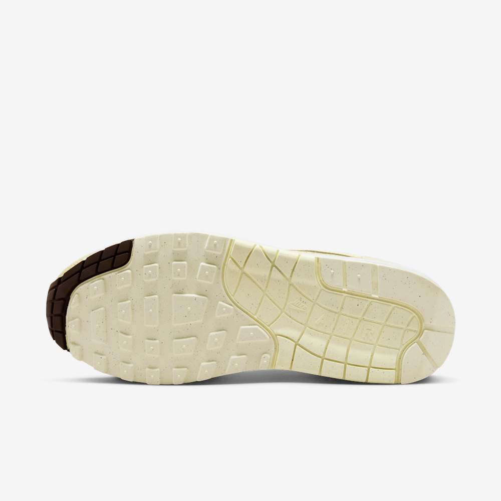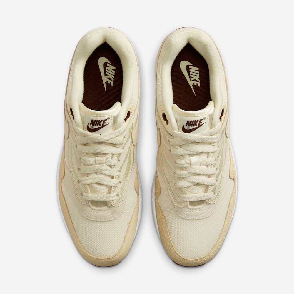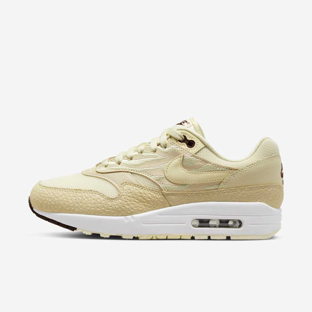 The Nike WMNS Air Max 1 ’87 “Coconut Milk” is a women’s-exclusive reimagining of the legendary Air Max 1 silhouette, blending mesh, leather, and suede in soft beige tones. Safari-inspired suède mudguard overlays, embroidered tiger-stripe mid-panels, and reptilian-textured heel embellishments create a refined and exotic aesthetic, all anchored by a pale-washed leather Swoosh and classic Nike Air branding on the tongue and heel.