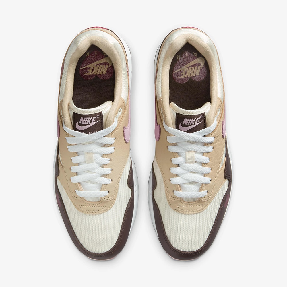 The Nike WMNS Air Max 1 ’87 “Valentine’s Day” (FZ4346-200) is a women’s exclusive release celebrating love through a nostalgic yet elegant reinterpretation of the Air Max 1 silhouette. This special edition features a warm color palette of Sail, Light Soft Pink, Coconut Milk, Varsity Red, and Baroque Brown, evoking the sweet tones of Neapolitan ice cream — a playful nod to Valentine’s Day indulgence.