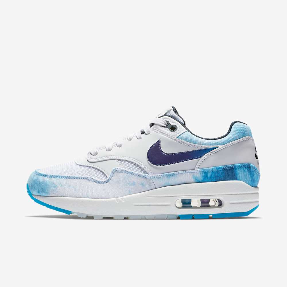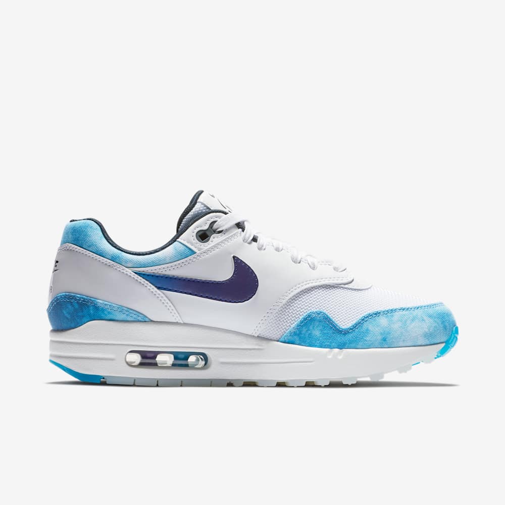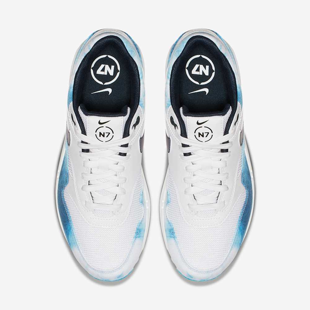 The Nike WMNS Air Max 1 “N7” is a women’s sneaker released on June 21, 2018, and is part of Nike’s N7 collection, which supports Indigenous youth sports and community programs. It features a white mesh and leather upper with a unique acid-wash pattern on the mudguard and ankle area, inspired by traditional Indigenous dyeing techniques. A gradient Court Purple Swoosh adds a vibrant touch, transitioning from purple to blue, while Dark Obsidian accents the inner lining. The N7 branding is prominently displayed on the tongue.
