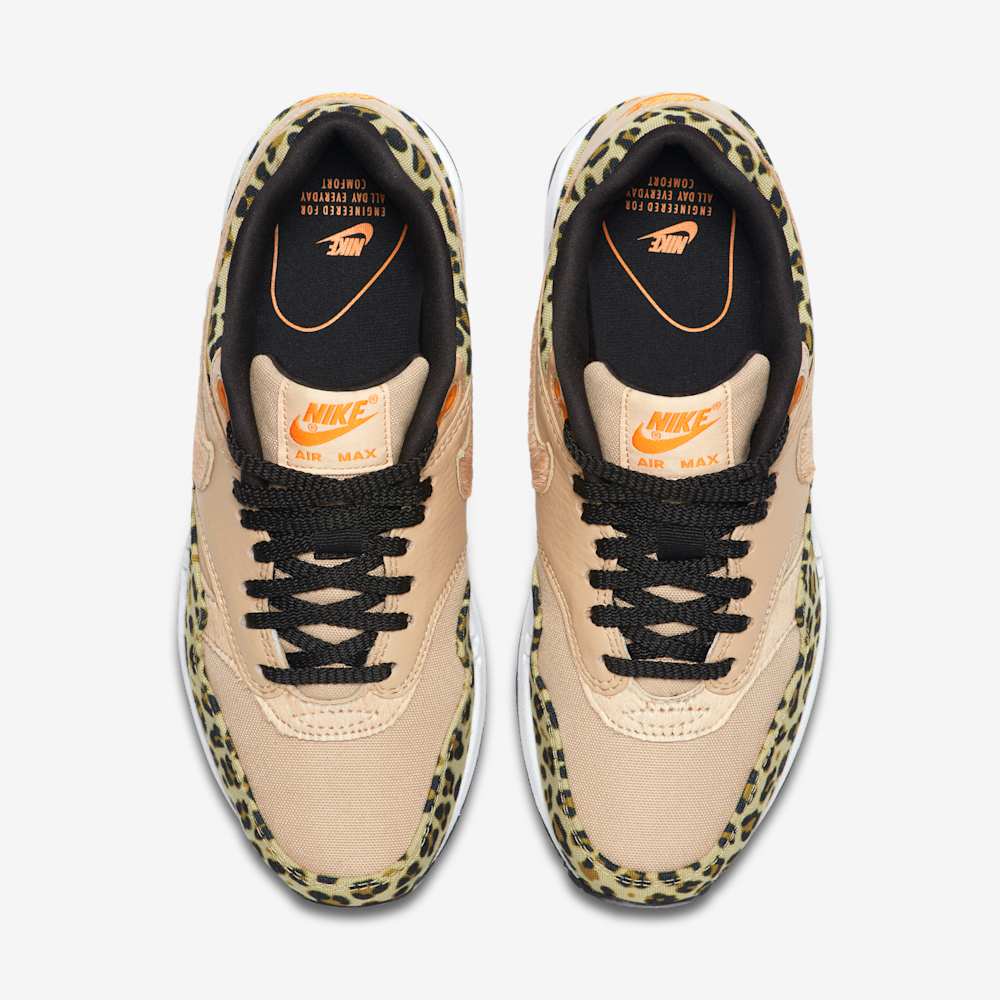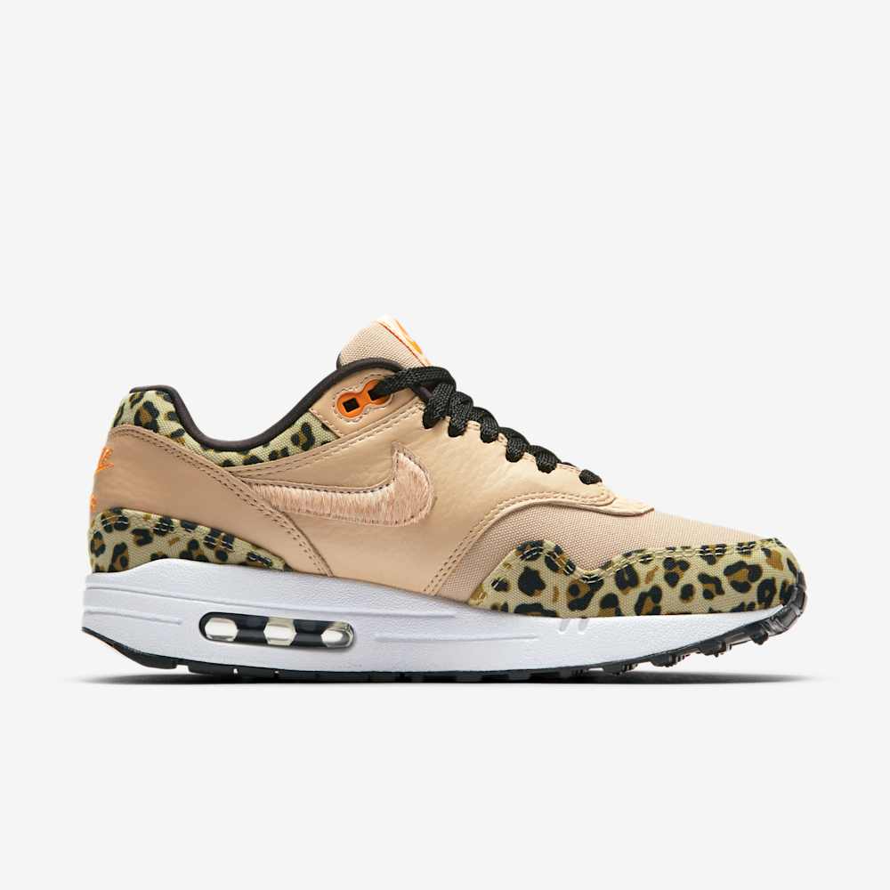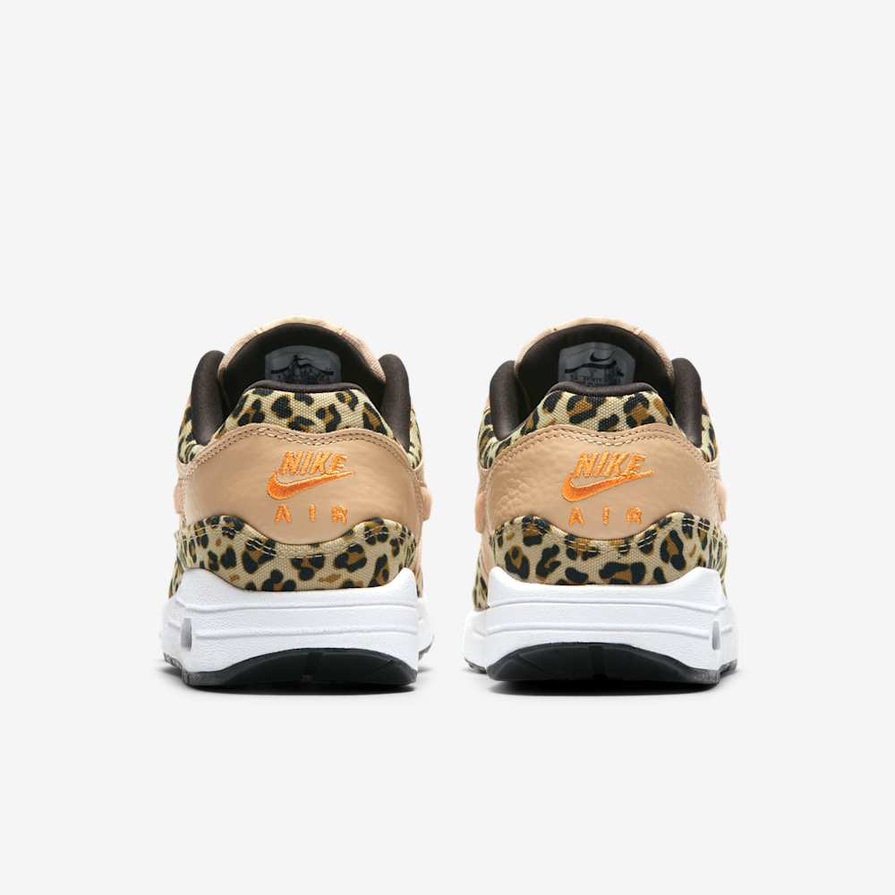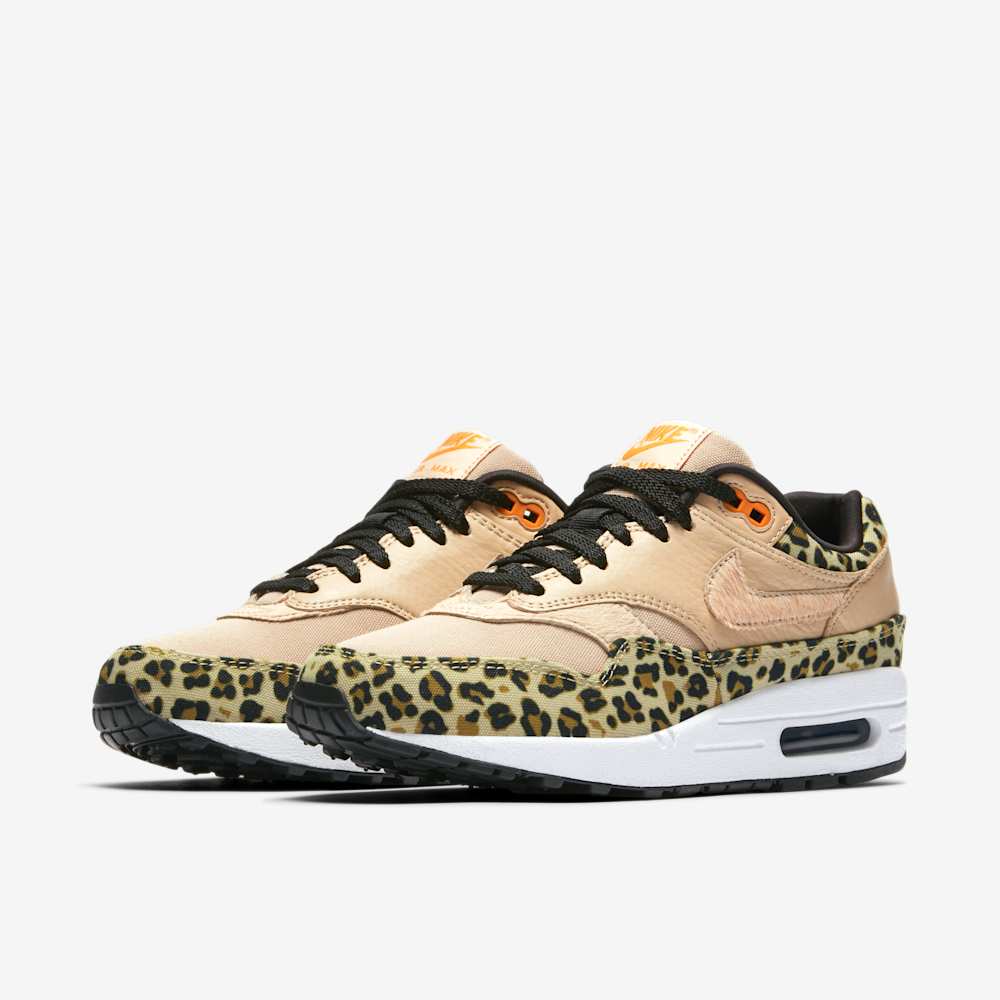 The Nike WMNS Air Max 1 Premium “Leopard” is a women’s exclusive release from Nike’s 2019 “Leopard Pack”.This iteration of the classic Air Max 1 silhouette features a Desert Ore, Orange Peel, and Black color scheme. The upper combines mesh and tumbled leather, with pony hair detailing on the Swoosh and forefoot. Leopard print adorns the mudguard and collar, adding a wild touch to the design. A white foam midsole with a visible Air unit in the heel provides cushioning, while a black rubber outsole ensures traction and durability. Subtle Orange Peel accents on the tongue and heel branding complete the look. This bold and stylish sneaker is perfect for those looking to make a statement.