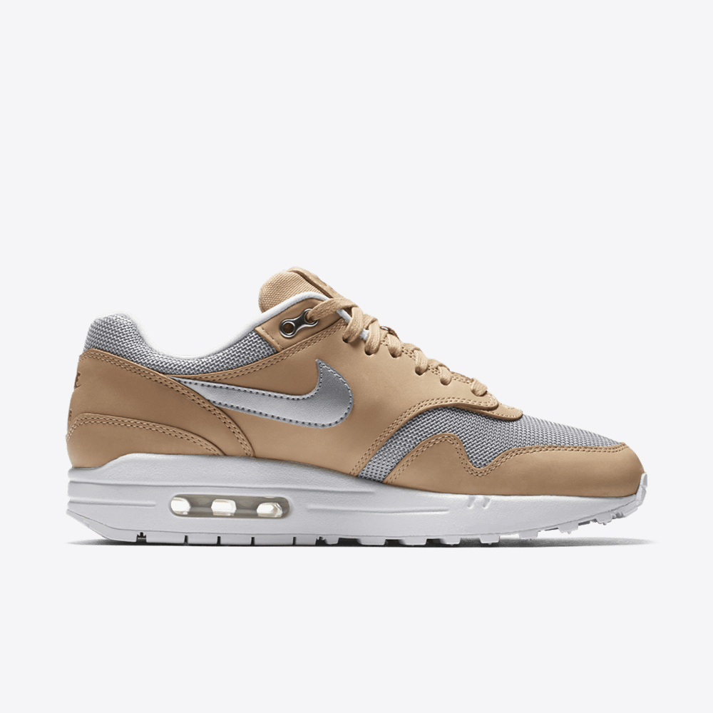 The Nike WMNS Air Max 1 SE Premium “Vachetta Tan” (AO0795-200) elevates the classic silhouette with a luxurious tan suede upper paired with metallic silver mesh overlays and a matching Silver Swoosh. Accented by a clean white midsole and visible heel Air unit, the design strikes a sophisticated balance of warmth and shine.