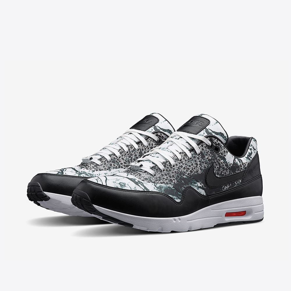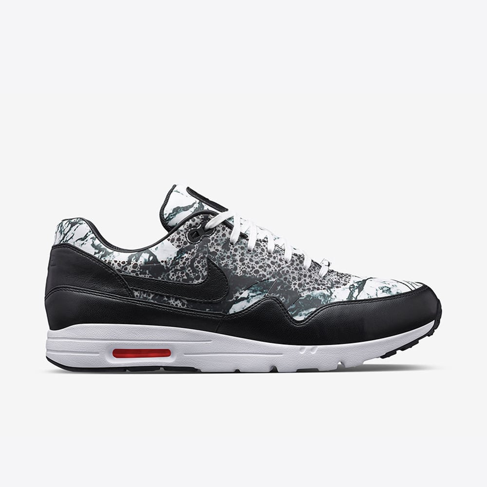 The sneaker features a striking black-and-white marbled upper, creating a dynamic, almost stone-like visual effect that sets it apart from traditional Air Max 1 colorways. Black leather overlays on the mudguard and heel add structure and contrast, while a black Swoosh seamlessly anchors the design. The lightweight Ultra midsole modernizes the classic silhouette, offering reduced weight without sacrificing comfort.